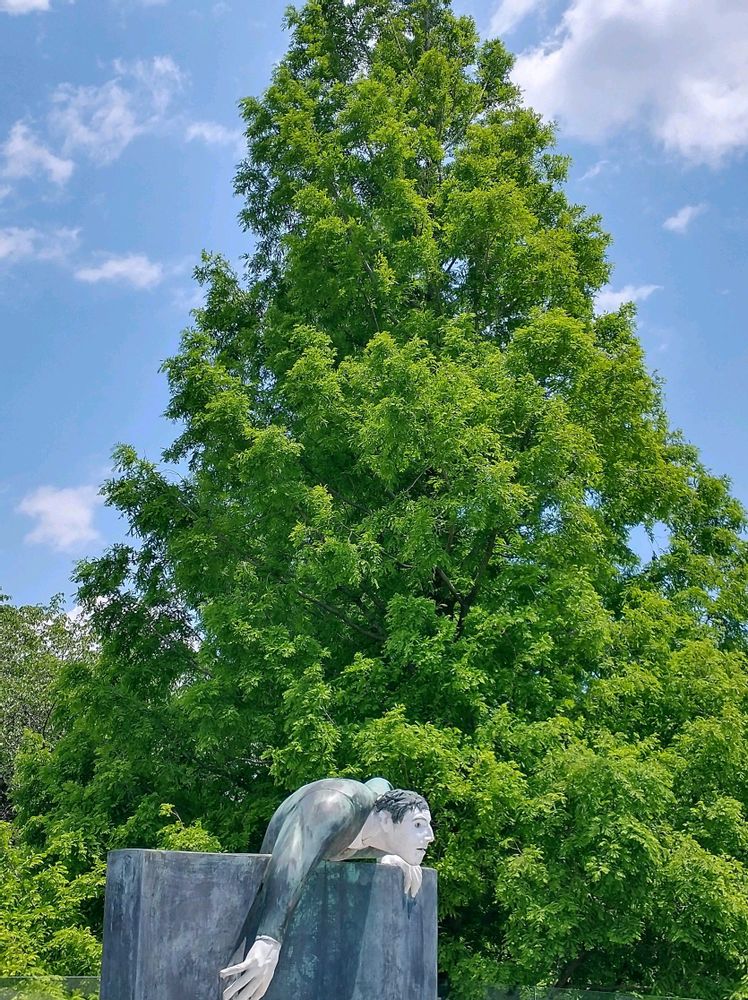 ①木はメタセコイアだと思います 彫刻は〜?忘れたけど、私が名付けるなら『乗り越える』かな(調べたら『壁をよじ登る男』でした)😁