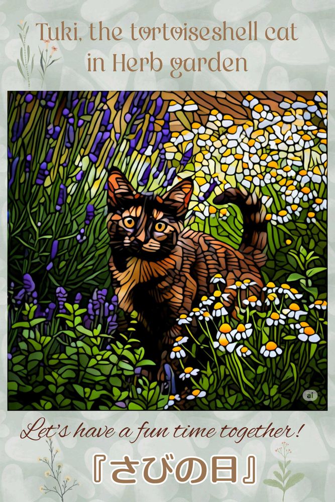 そして、居眠りしてサボっている月ちゃん🌛の代わりに、コラージュアプリで印象派風の絵に加工したら何度やり直しても黒猫🐈⬛判定されてしまう月ちゃん🌛(2枚目📷)と生成AIのGoogle Geminiさんに作ってもらったステンドグラス風の「ハーブガーデンの月ちゃん🌛」(3枚目📷)がご挨拶いたします😸✨