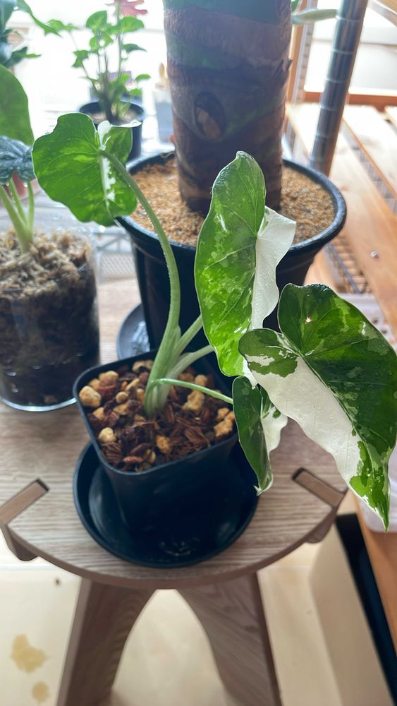 沖縄シルバーです。ホームセンターにあったどでかい斑入りクワズイモは6万したので流石に手が出ず、、せっかくなら小さいのから自分で育てようとお迎えしました!