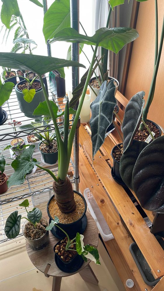 2025.8月に某サイトで購入した【アロカシア チャイ】の 突然変異?なんだろう 購入時、元々有った葉を(1枚目の葉)として、 下から新たな葉が出てきてる状態で到着しました(2枚目の葉) こちらに来て初めて出てきた葉に異変が。。 育て始めて出てきた初めての3枚目、4枚目 (途中から、斑1、斑2、、と続きます) どこまでこの謎の斑入葉が続くのか、 いや止まるのか……記録していきます