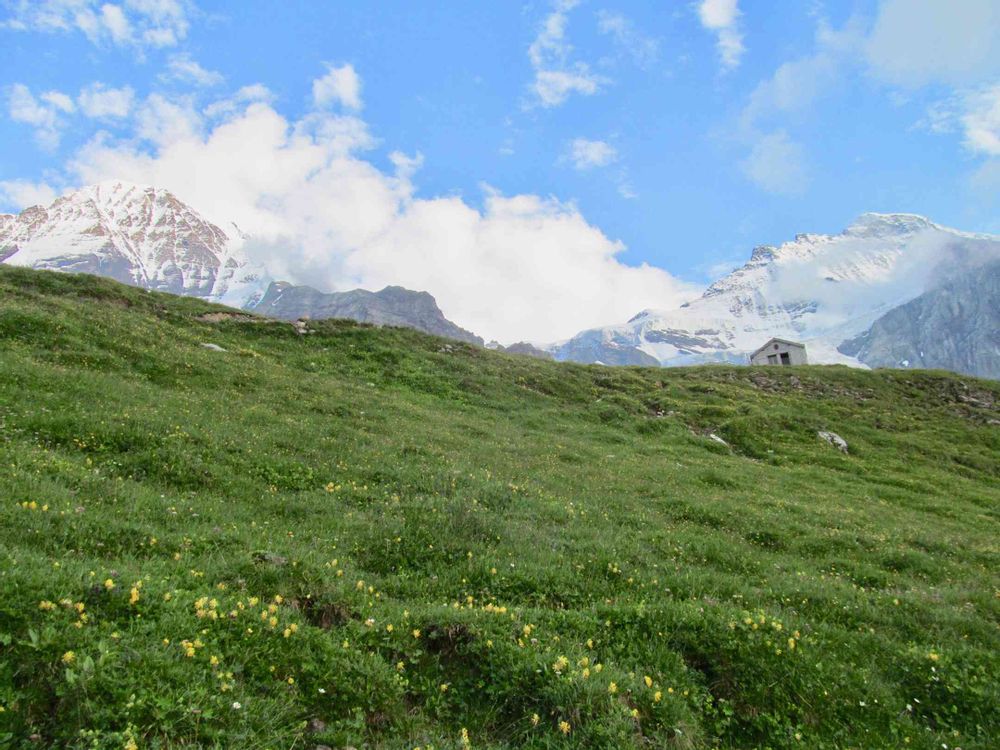 スイスのアイガーグレッチャーからクライネシャイデックへハイキングした時の一枚です。高山植物たちの後方にそびえ立っているのは、少し雲がかかっていますが、右からユングフラウ、メンヒ、アイガーの山々です。