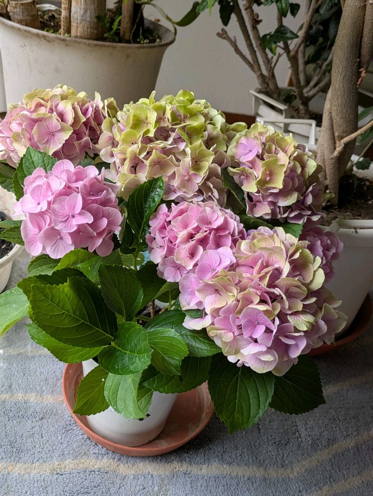 不思議な色のアジサイを買いました。昨日目をつけて、今日は雨で20%オフだって。少しでも安いのはラッキーでしたよ。直射日光は葉焼けするとのこと。確かにアジサイに強い日光はダメね。
