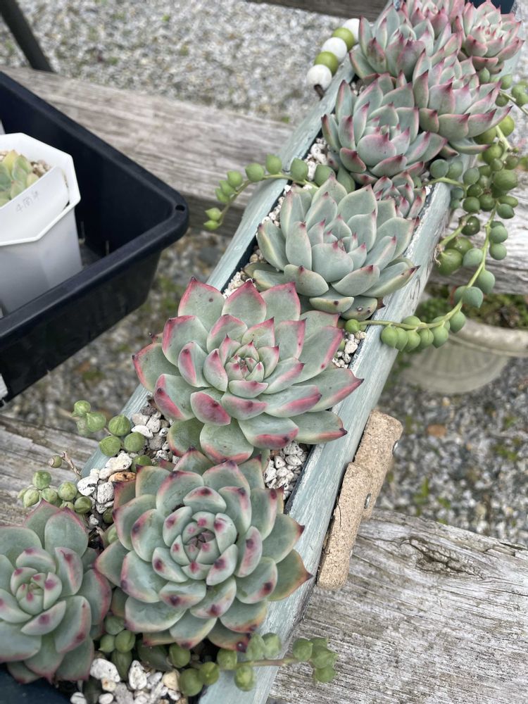 1枚目は葉挿しで増えた桃太郎さん🍑ロング木鉢に並べてみました🤗可愛い