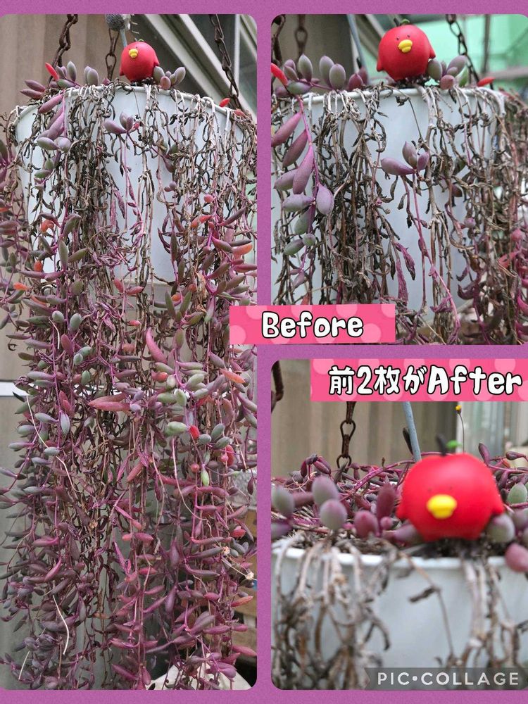 Beforeが酷すぎて😆枯れ枯れの所を切って一回全部抜き吊り下げ鉢のはピンセットで先端指して埋め込み、長めのルビネちゃんを何本か🌀グルグル置いて上から土を掛けてます