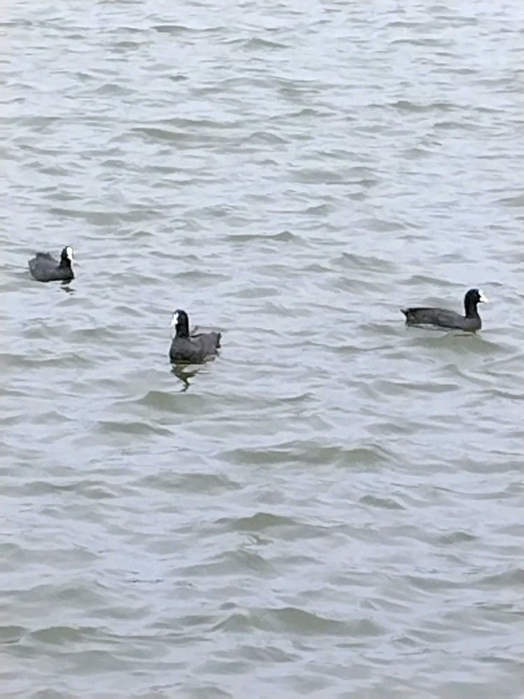 「トリオ♪オオバン鳥」黒いスーツで仲よく♪波にチャプチャプ浮かんでました♪♬♬