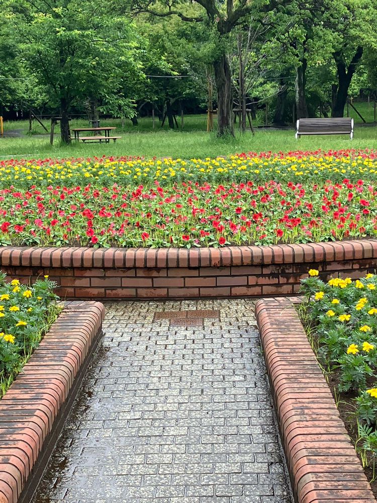 雨の中、千葉県市川市の里見公園にいって来ました 誰もいない円形のバラ園 雨☂️のせいか香りを感じないけど華やかなひと時を過ごせました 児童も遊べる遊具もありますよ