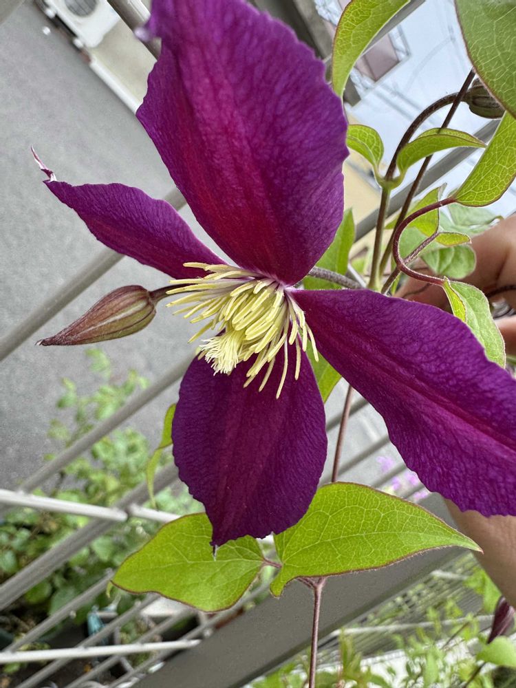 鉢をフェンスのところに持って行き、行きたいところに絡みなさ〜いと放置したら、この子達、真っ直ぐに伸びて直立したままお互いに絡み出し、フェンスを超えてお辞儀しながらさいておりました😅