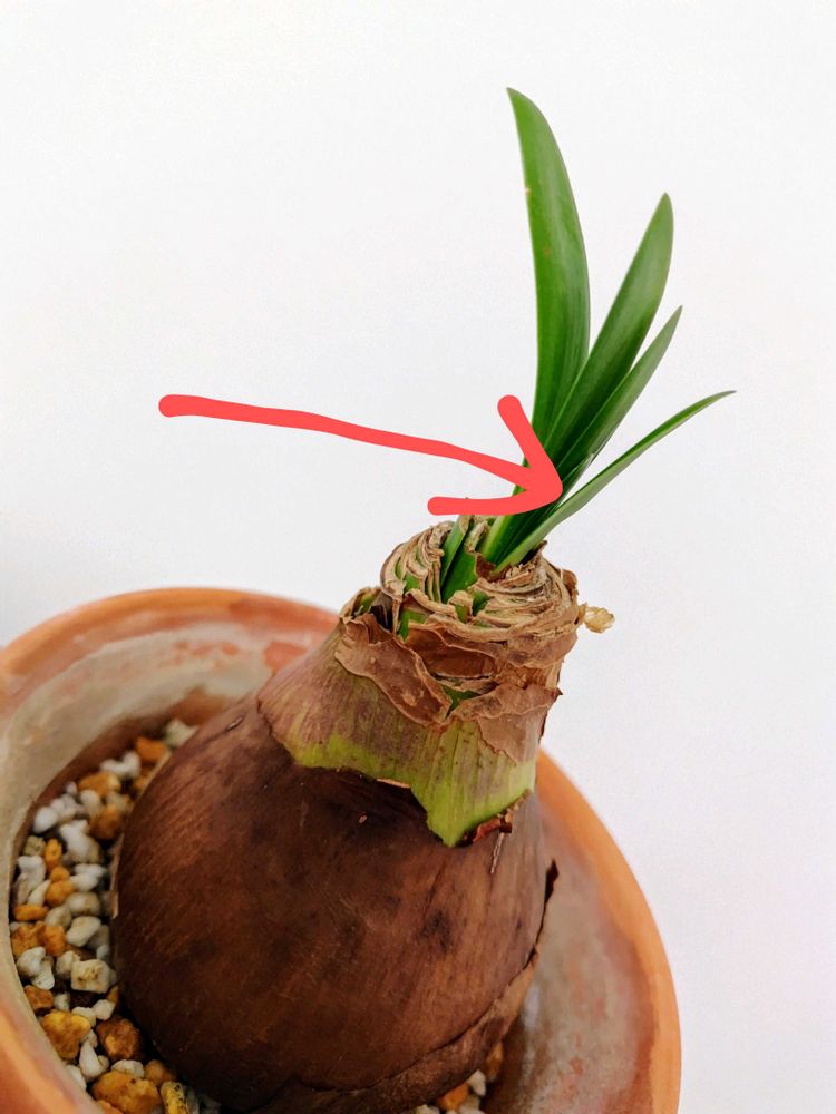 ➄マジックアマリリス鉢植えにチャレンジ中 5枚目の葉が出てきたけれど根っこは出ているのか不明😅