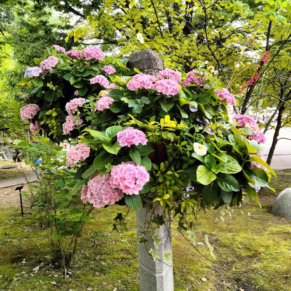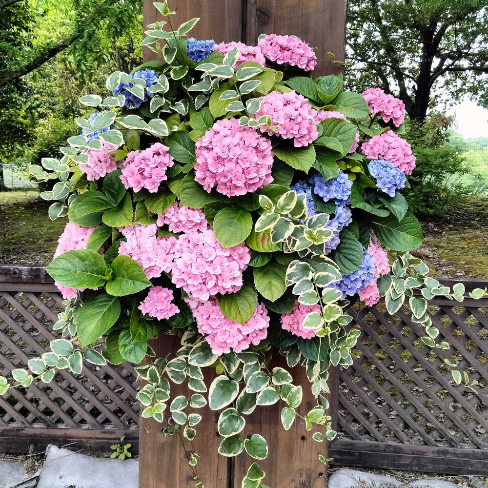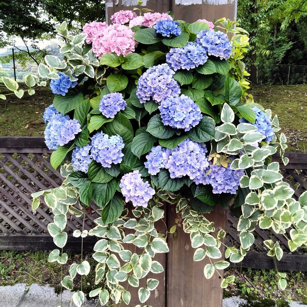 ピンクとブルーがいい感じに組み合わさって紫陽花のこんな寄せ植えはボリューミーでとても素敵でした💙🩷🩵💚