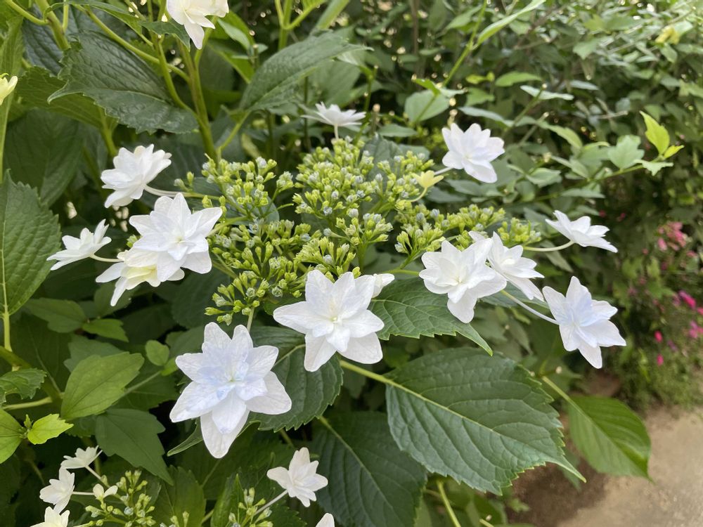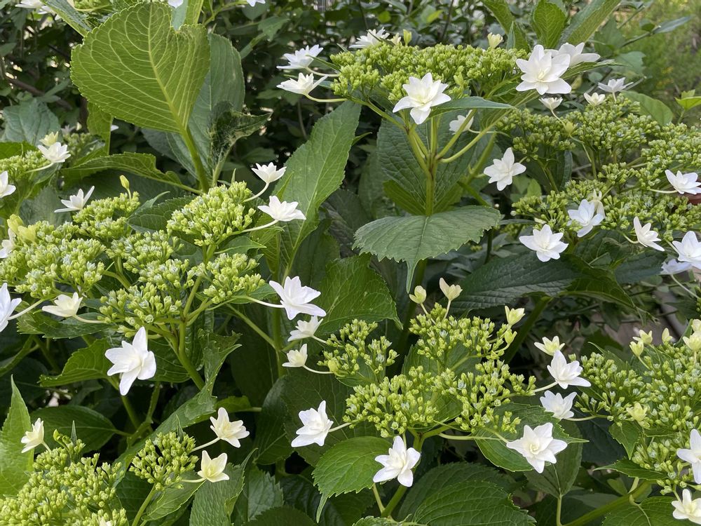 毎年葉っぱを虫ちゃんにほぼ全部食べられ咲かなかったカシワバアジサイも、今年は葉も花も元気で4、5輪咲いていました