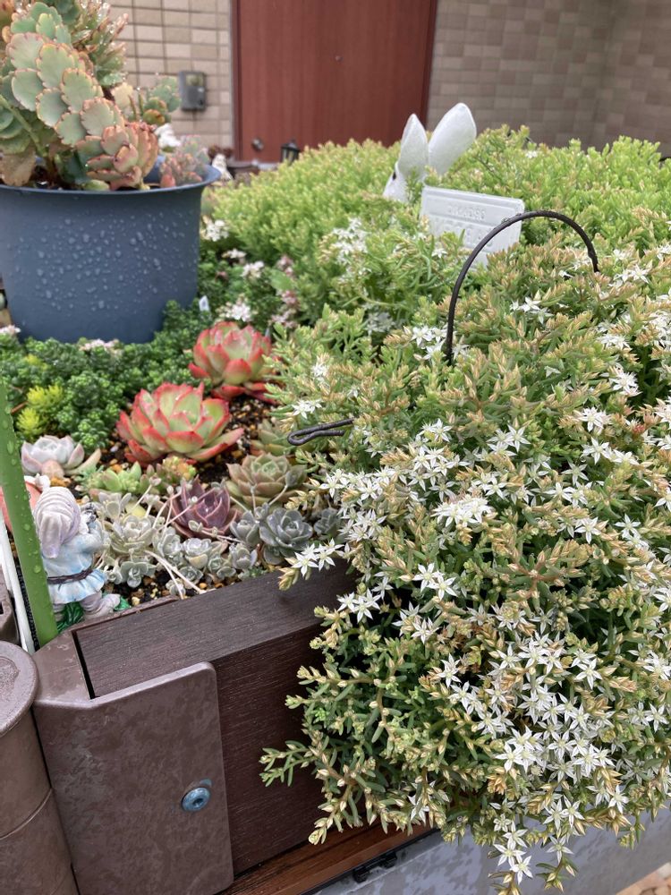 雨晒しの場所なので、敢えて色々な多肉さんを混植して、余分な水分をセダムさんに吸い上げて貰っています😃