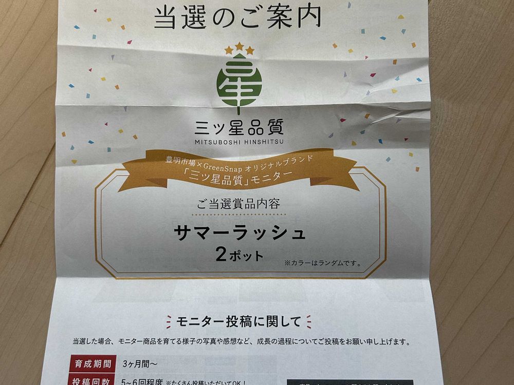 三つ星品質さんのサマーラッシュモニターに当選しました。モニターやアンバサダーに当選したのは初めてなので、少しでもお役に立てるよう大切に育て、投稿したいと思います。