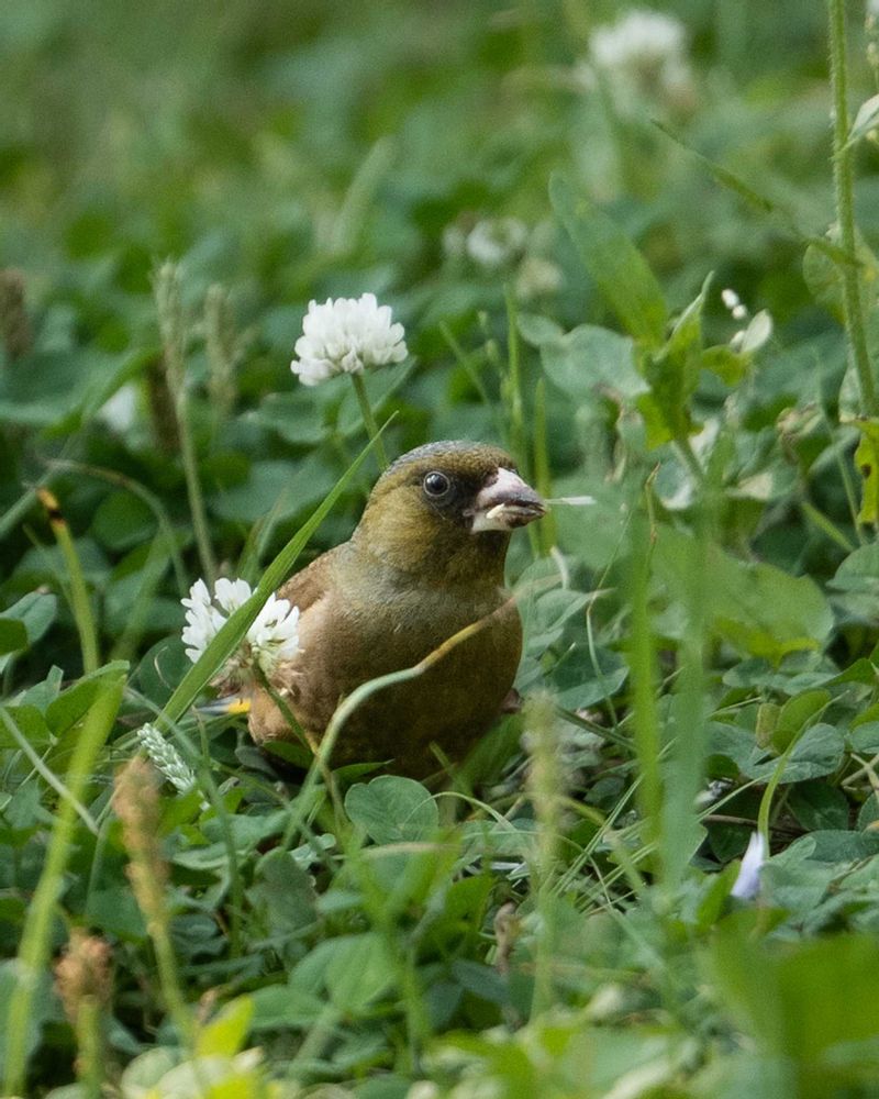 本日5月のオオトリ。シロツメクサの草原でカワラヒワが採餌していました。2025.05.14.