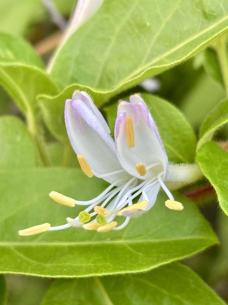 スイカズラが咲き始めの頃、花の上部が淡いピンク色のスイカズラを見つけました😊💕