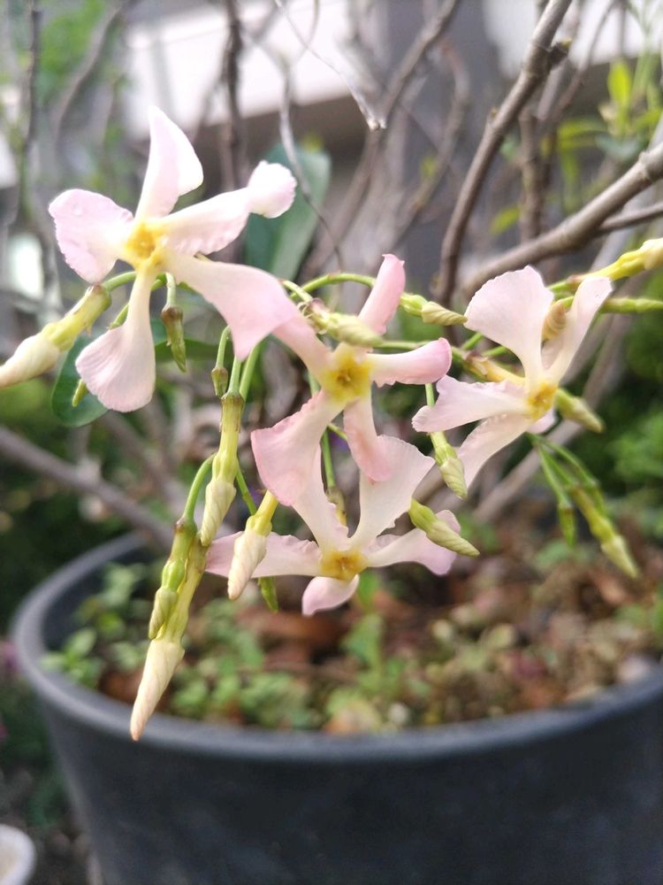 テイカカズラ。鉢植えです。一日雨の畑を見たらネギ苗の中にかすみ草ジプシーが咲いてました。思わずラッキー