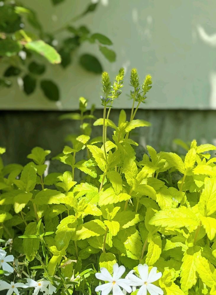 ベロニカアズテックゴールドはグラハムトーマスとピエールドゥロンサールの間の株元にあります🌿🌹