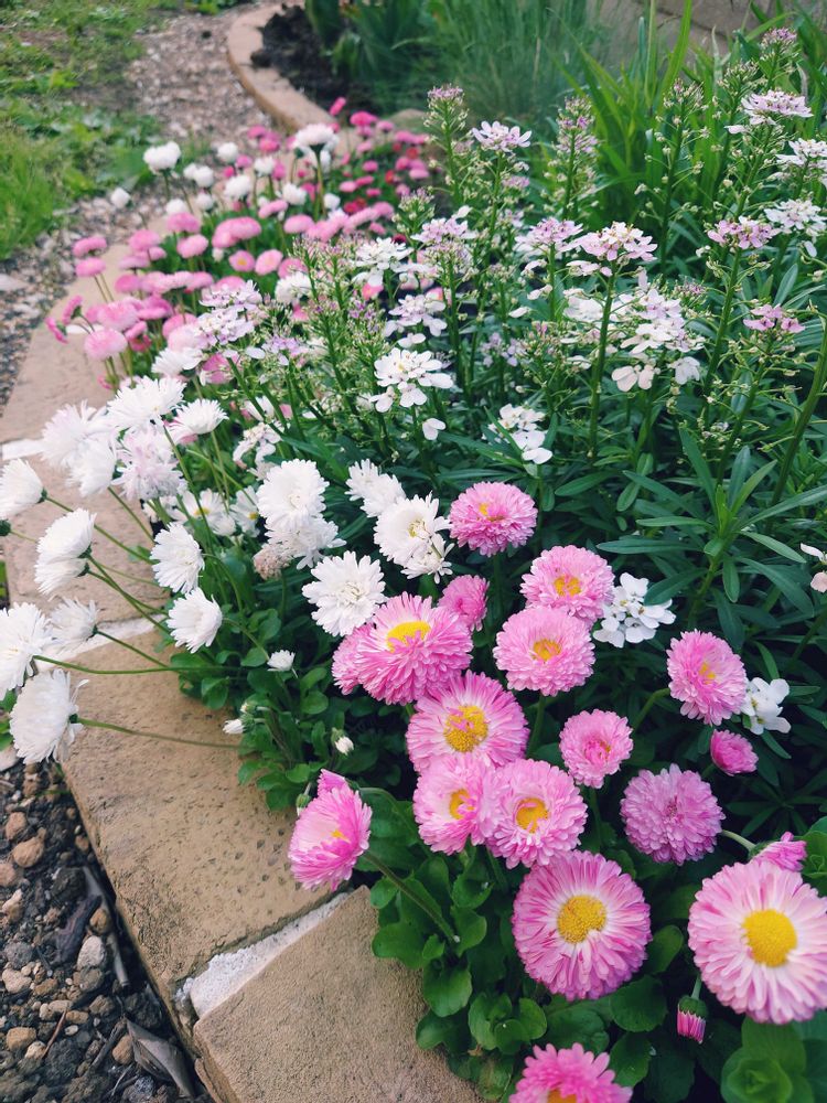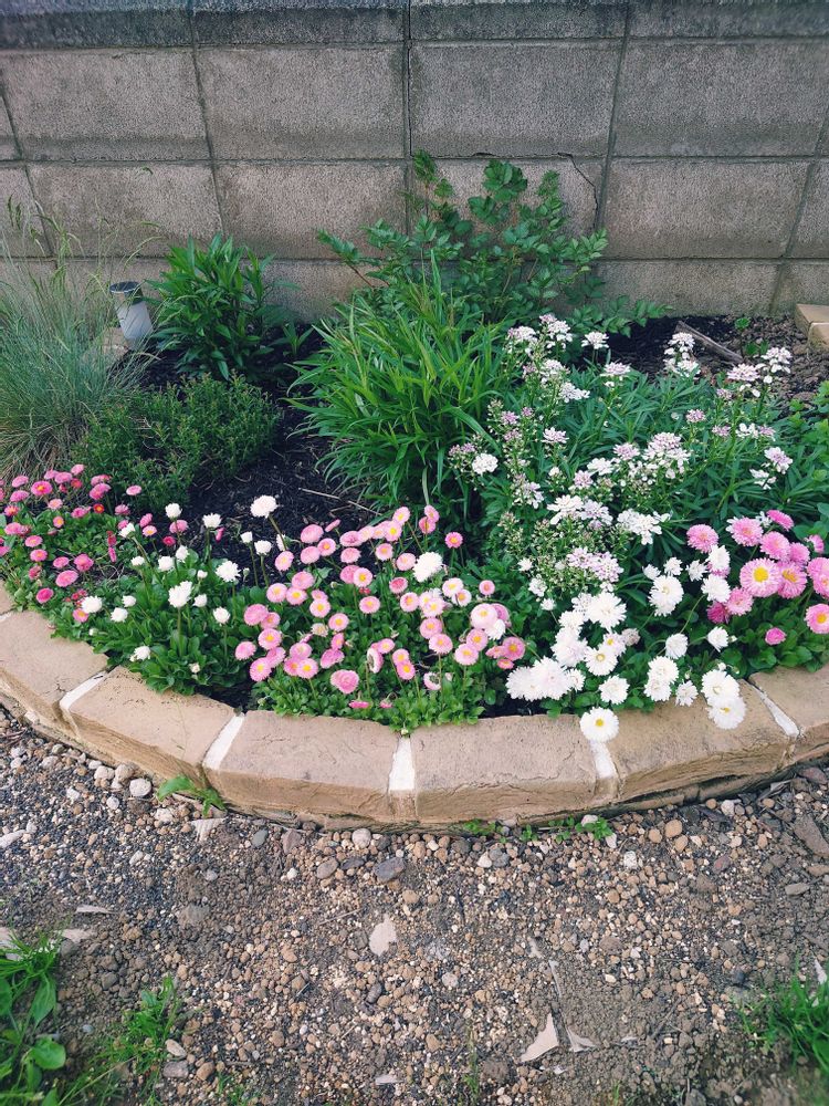 多年草だけで構成した手作り花壇…イベリスのお花が少し散り気味の中、北国限定多年草のデイジーが去年と比較して中々のボリュームアップ(゚∀゚)