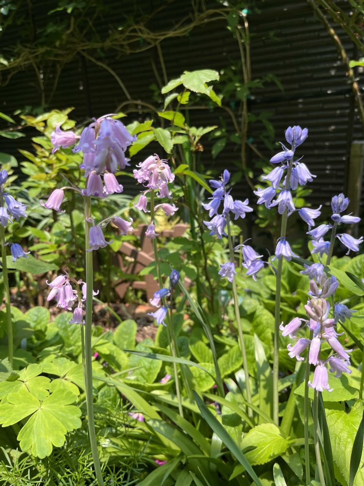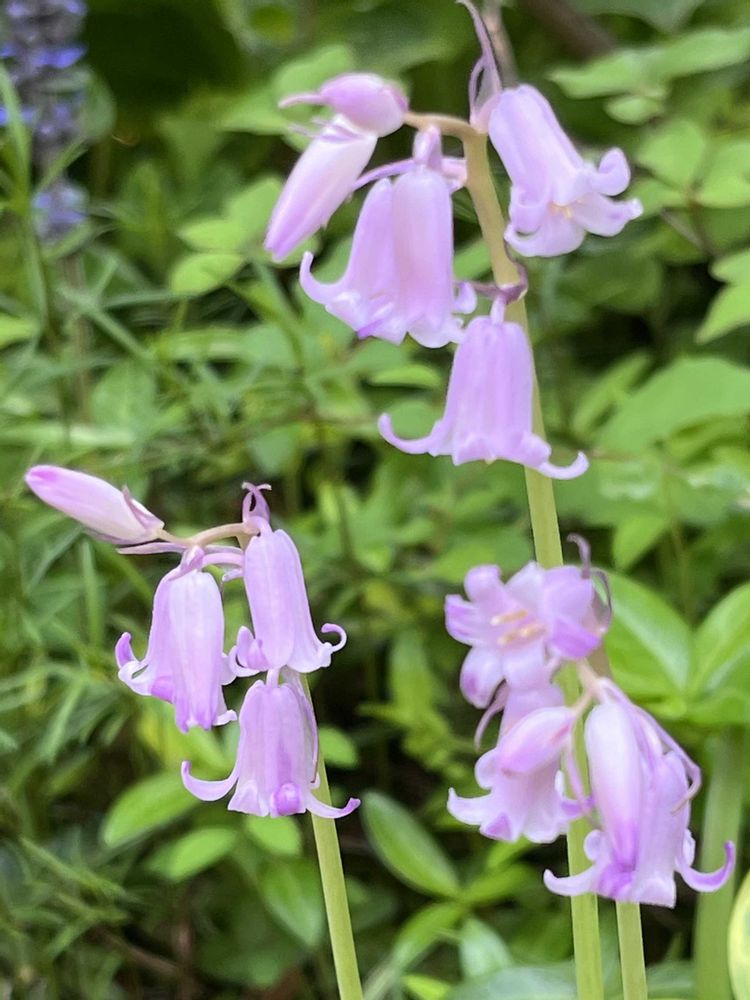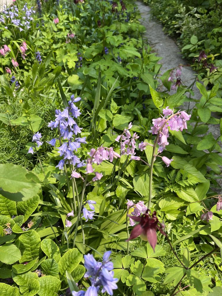 シラーカンパニュラータが咲き揃いました 溢れ種で飛んだピンクと紫の花が庭のあちこちで咲いて可愛い花壇になりました スライドして下さいね