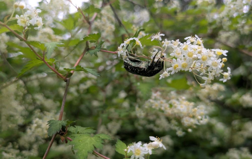 満開となったコゴメウツギにカナブンむしゃぶりついて。