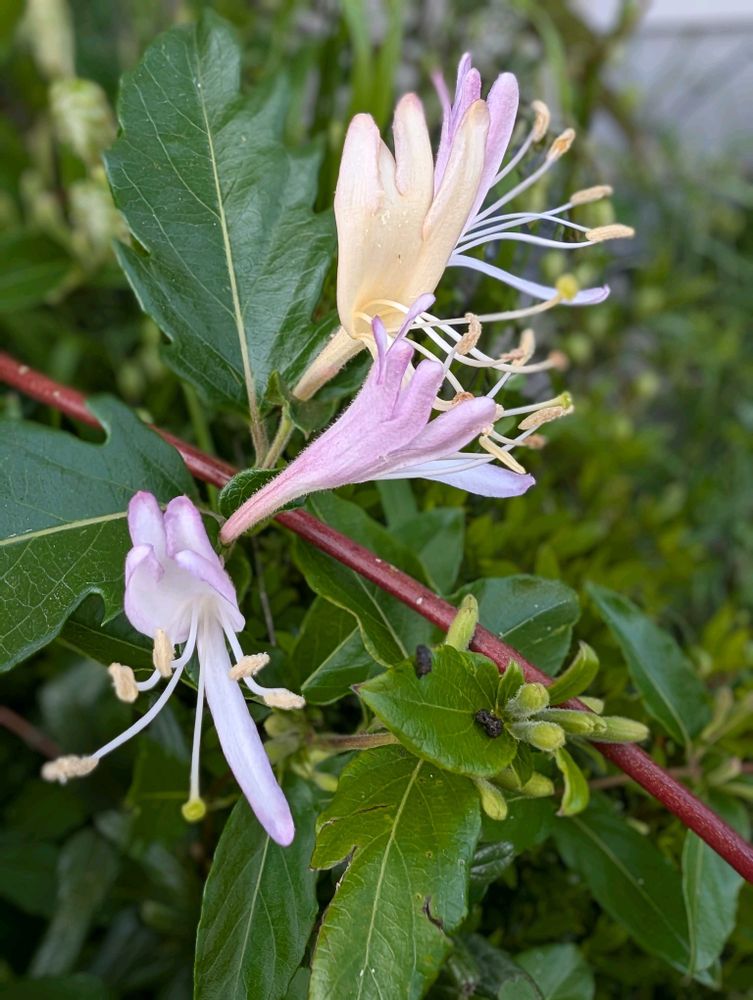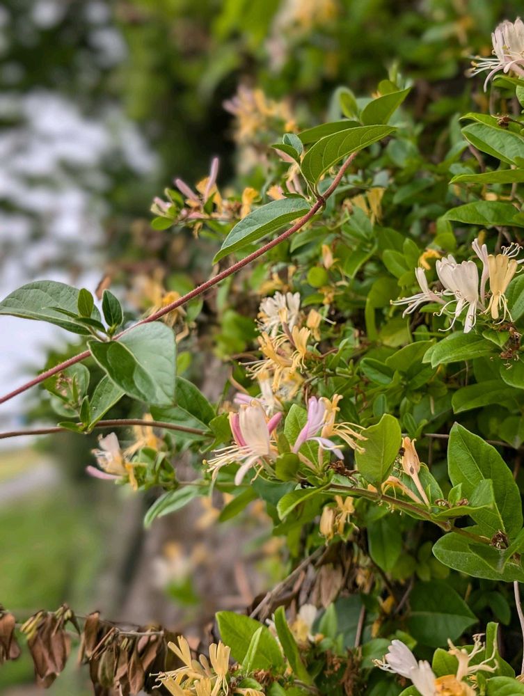 スイカズラの花は白か薄いピンクで咲いて黄色になって終わるんだと思います🤍🩷💛