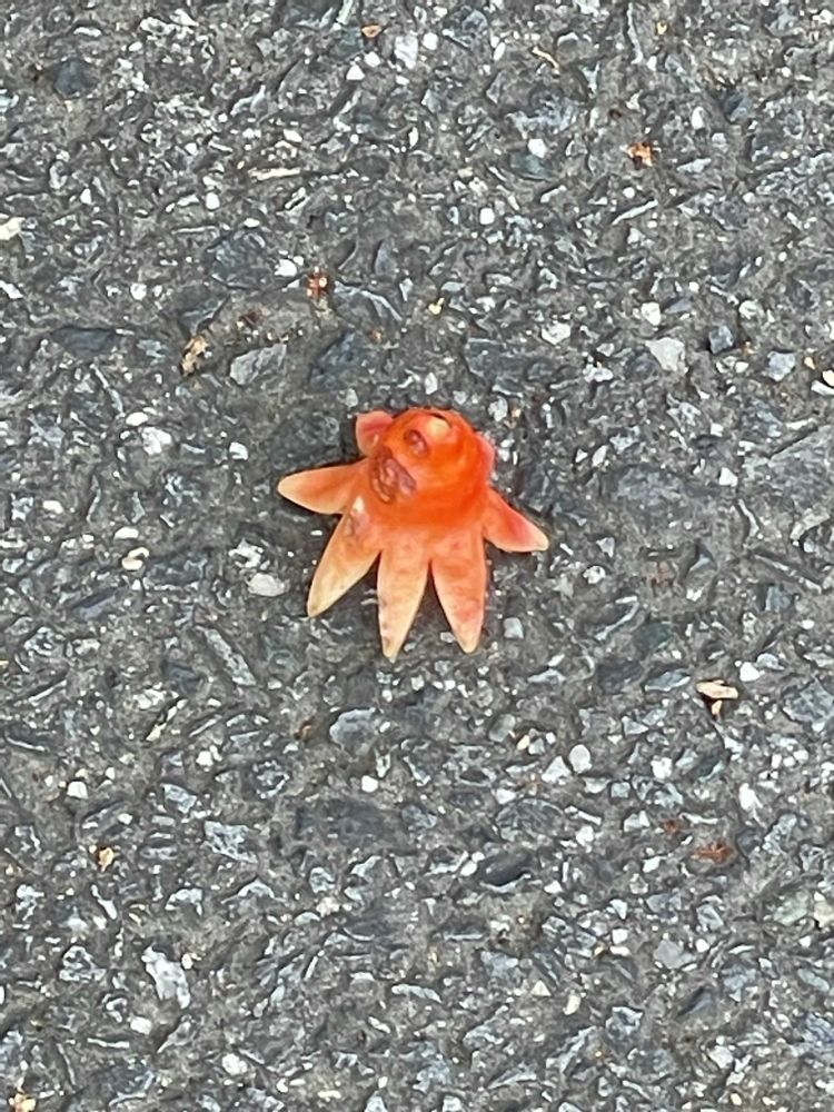 孫と遊びに行った時も砂場に落ちてた。私の頭の中には『タコさんウインナー🐙』が何故ここに❓よく見たらザクロのお花でした。今回も思わず道端に何故タコさんウインナー🐙があったのか❓と思いました😊💓