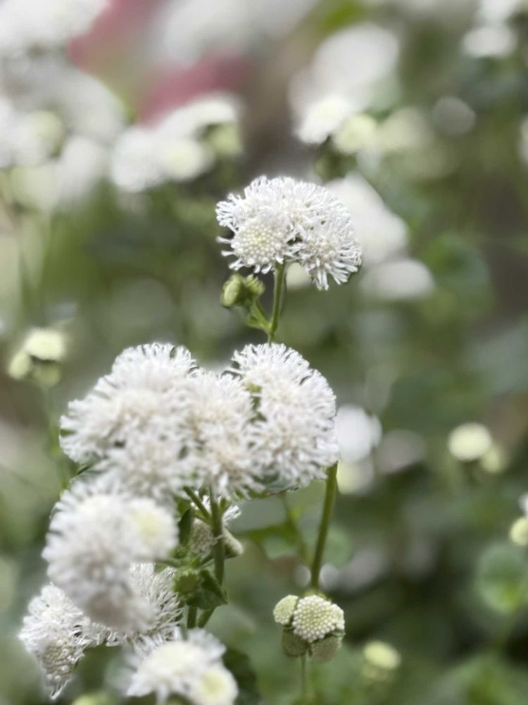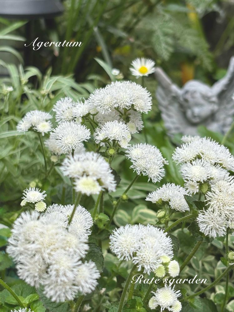 曇り空の中、白いアゲラタムが