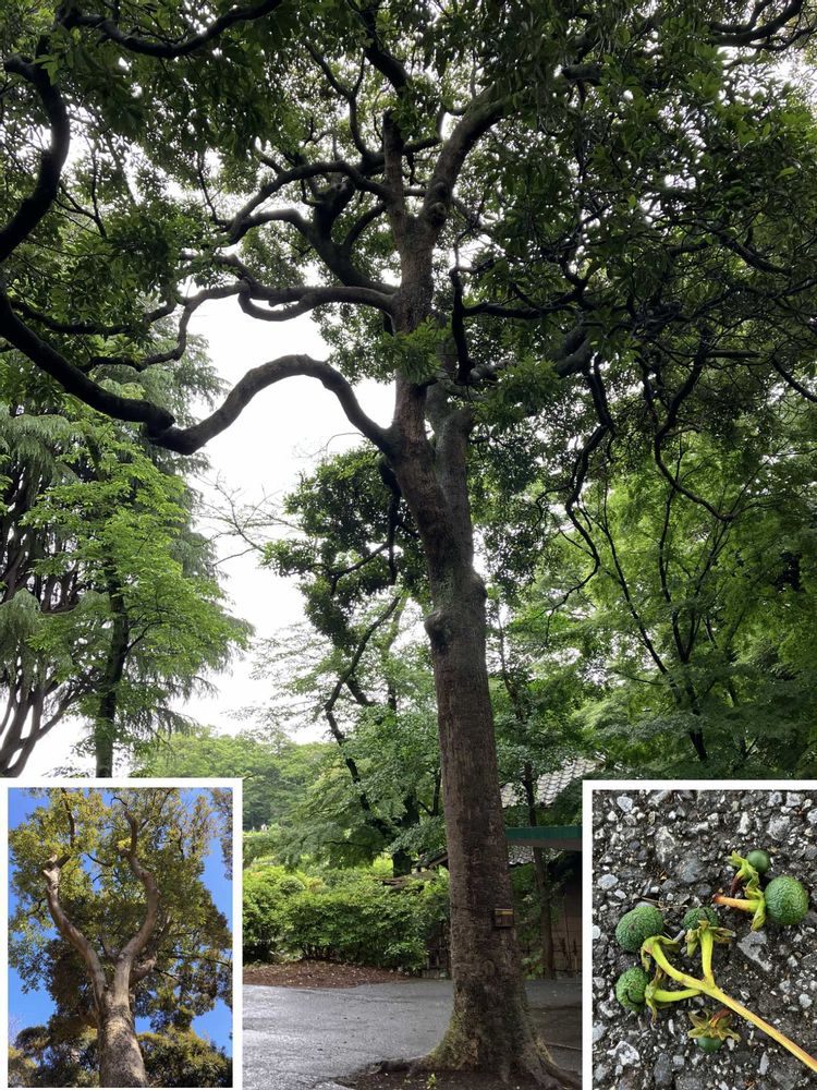 曇り空で小雨 木の姿が面白いので撮った(青空で撮った同じ木) 他所で撮った果実(アボカドの味がするそう) 葉はクチクラと言う防水ワックスでコーティングされていて水の蒸発を防ぎ、光り輝く(照り葉)をつけるので照葉樹です