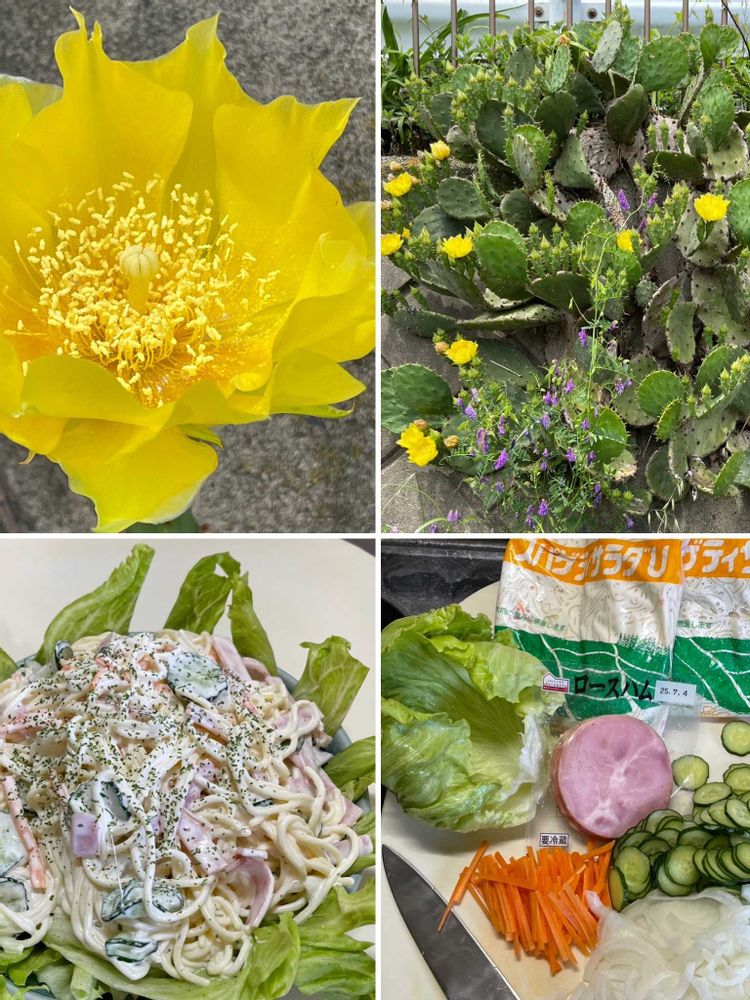 上の道路の端の地面から護岸の壁伝いに下へ延びているうちわサボテンです❣️ なんだかカラスノエンドウに絡みつかれているようですが、黄色と紫の色合いもなかなかオシャレなのでそのままにしておきました😆