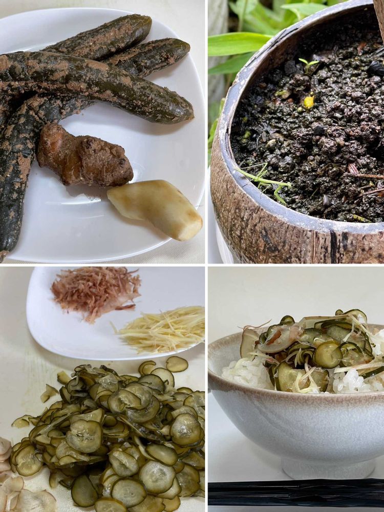1週間漬けてシワシワのクタクタにした胡瓜と菊芋を刻んでからキュッ!!っと絞って針生姜に鰹節にあと愛情をチョット加えて、さぁご飯の上へ🍚😋