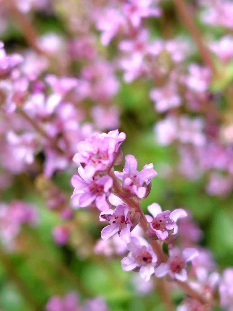 茎頂に総状花序を出し、径3mmほどの紅紫色の花を多数付ける。