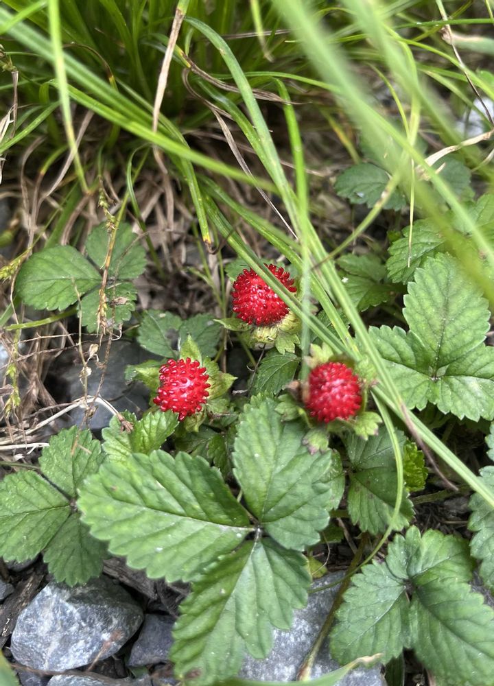 ヤブヘビイチゴの実は球体の部分が赤い。