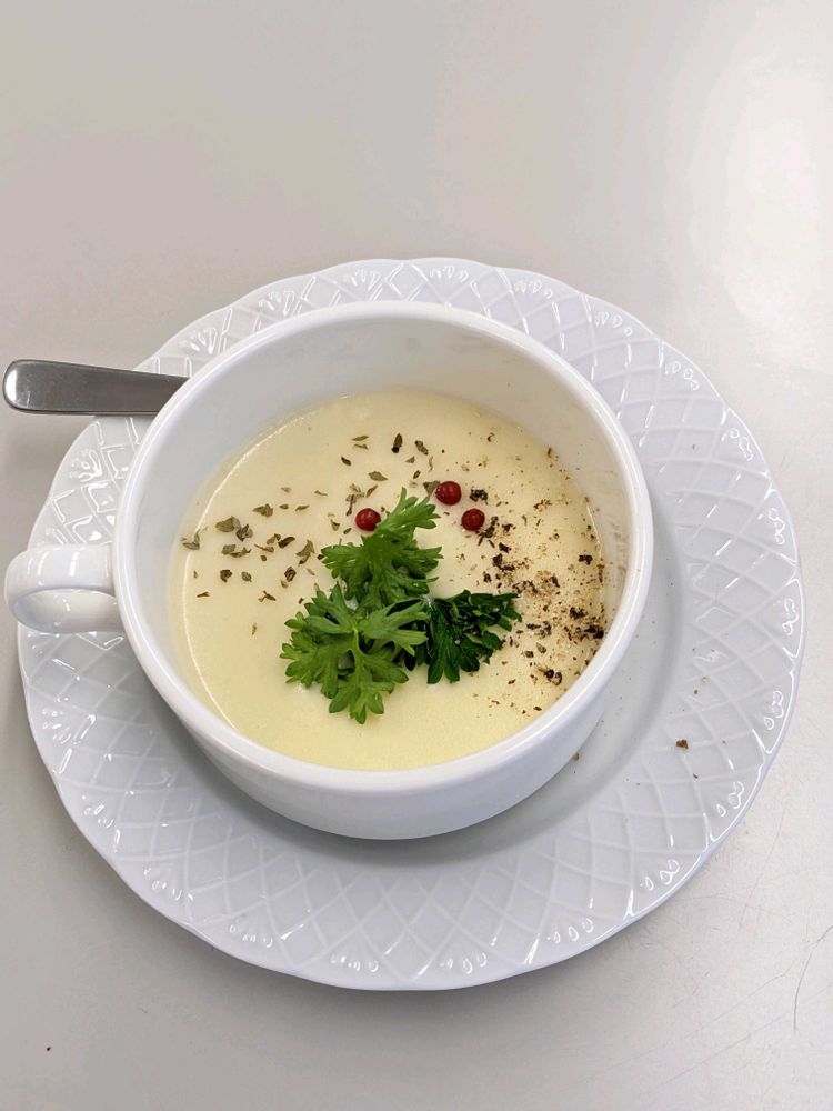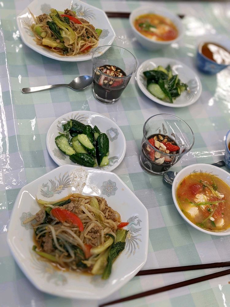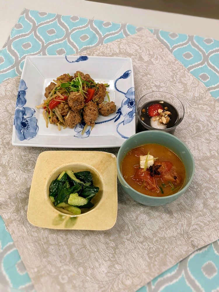 トマト🍅豆腐のスープに八角と花椒(ホアジャオ)きゅうり🥒のきのこ麴あえに大葉🌿午後から、おうち薬膳の講座で自家製のジャガイモのスープ🥔( ^^) _旦~~
