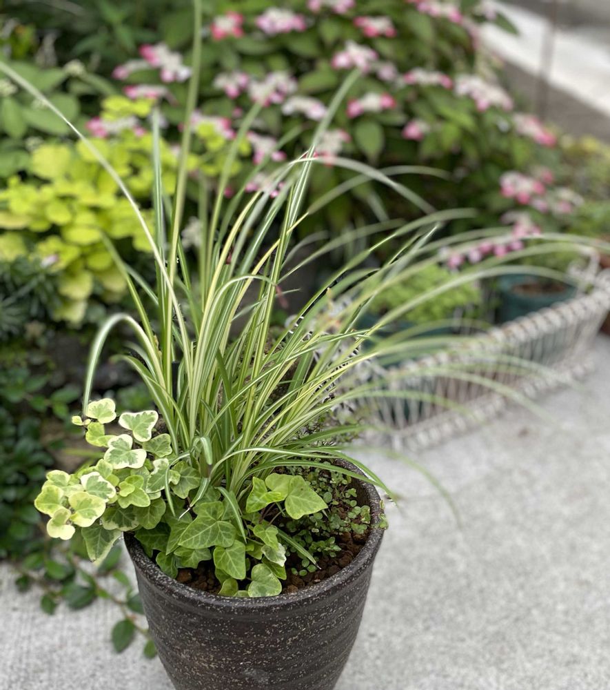 葉の長〜い折り鶴ランなどで、グリーンの寄せ植え作ってみました♪