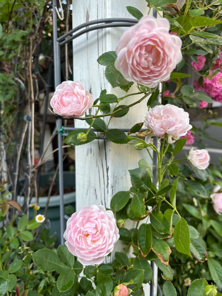 アップルローゼス初のつるバラ、まだ2年め、やっと可愛いお花が見れました。シュートが出ているのでこれから大きく育てたいと思います。