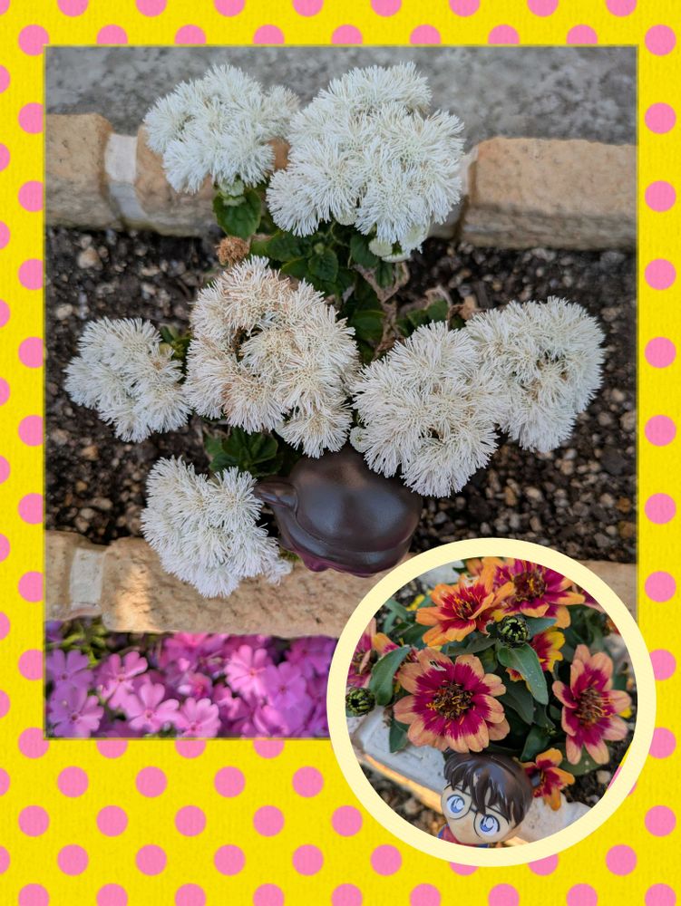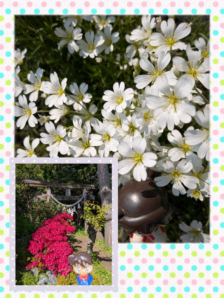 今朝の花壇の白い花たち🤍とコナンのどたま
