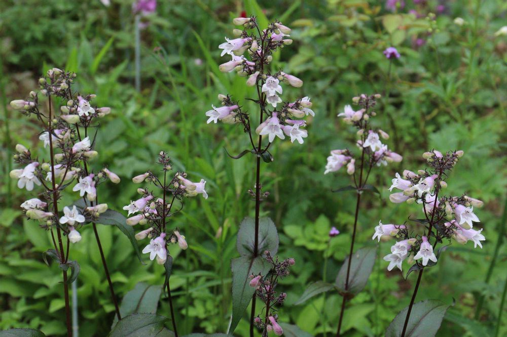 銅葉の間から長い花茎を出し、白い小花をいっぱいつけるペンステモン。