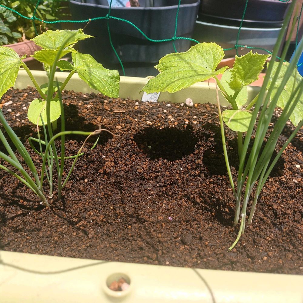 それからキュウリのコンパニオンプランツとして、青ネギのように混植したもの、