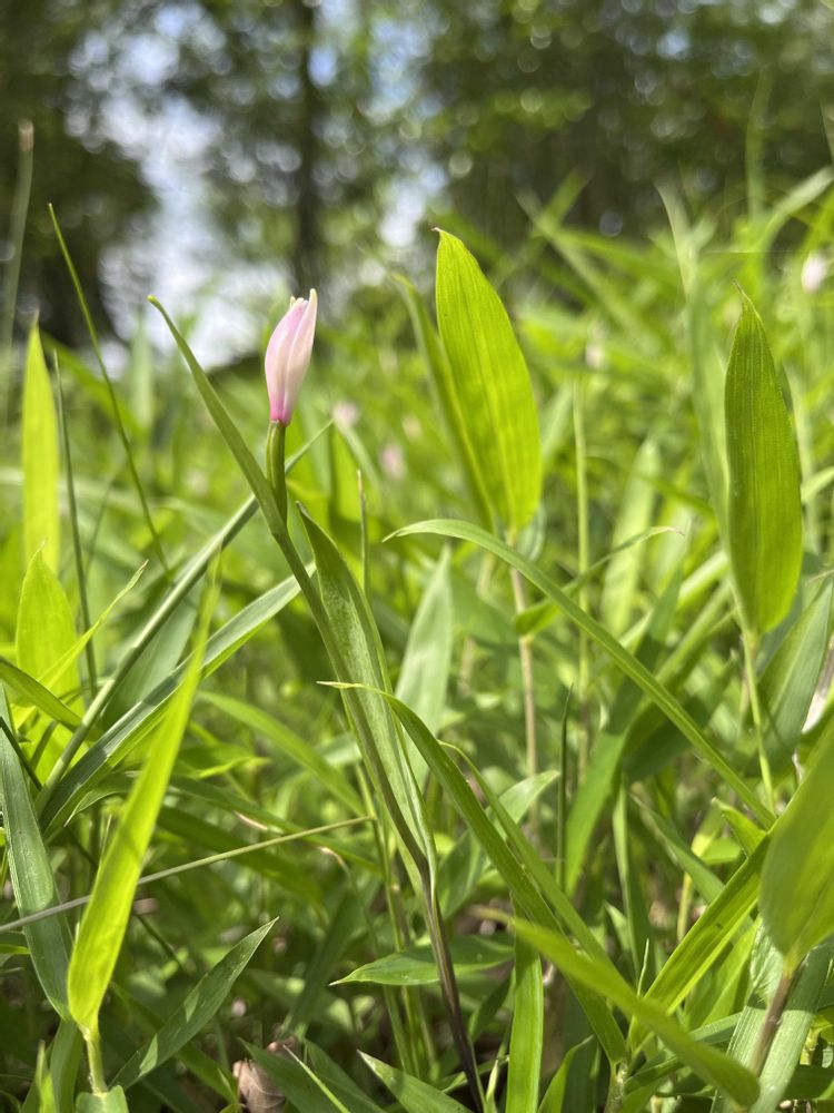 以前見た場所は湿地近くに咲いていた記憶でしたのに、昨日は小さな笹に紛れてピンク色の花がチラチラと見えてて、こんな所で咲く?と私もおもいましたよ。
