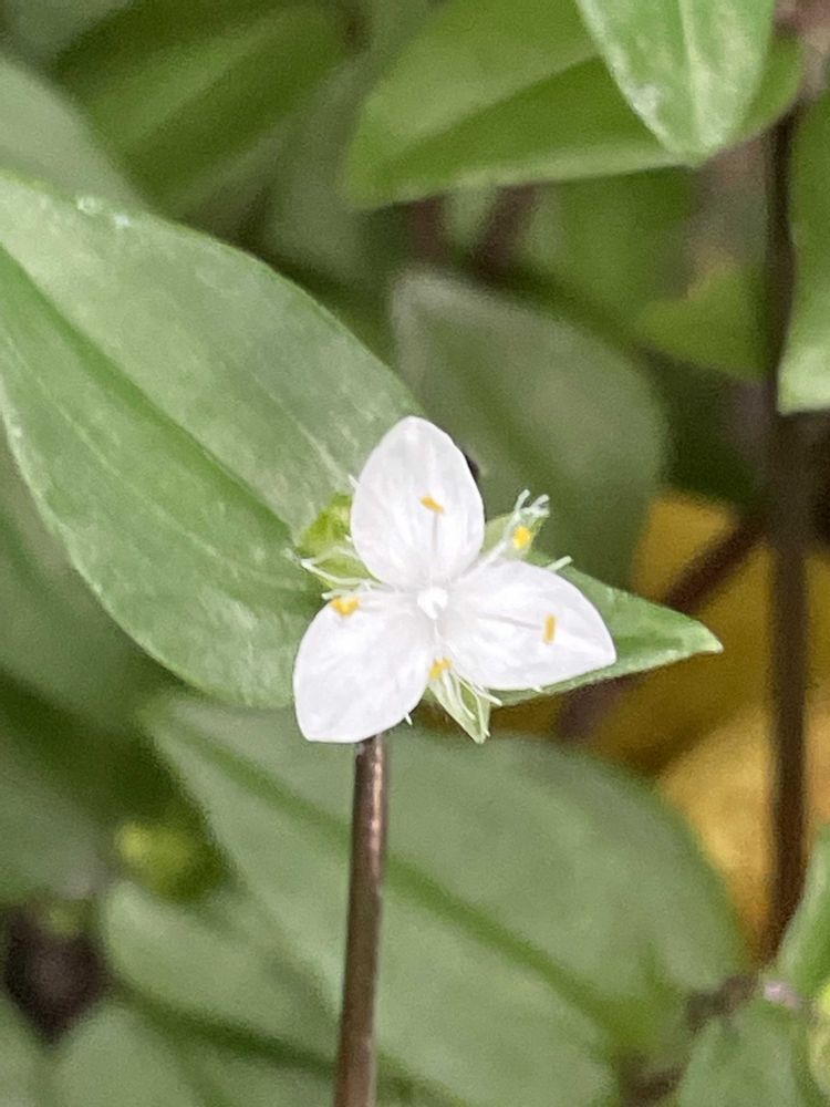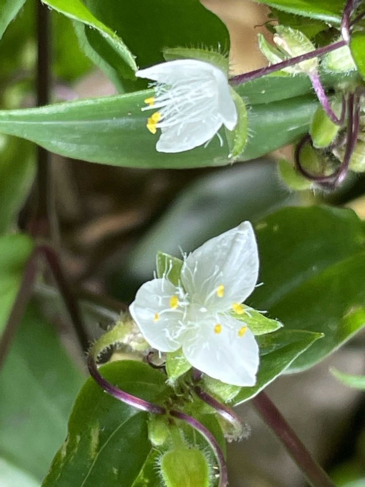 こちらは花茎、茎が紫ですね、ノハカタカラクサだと思います🤍葉裏も紫ががっているそうですよ!トキワツユクサも別名であっていたと思います😊