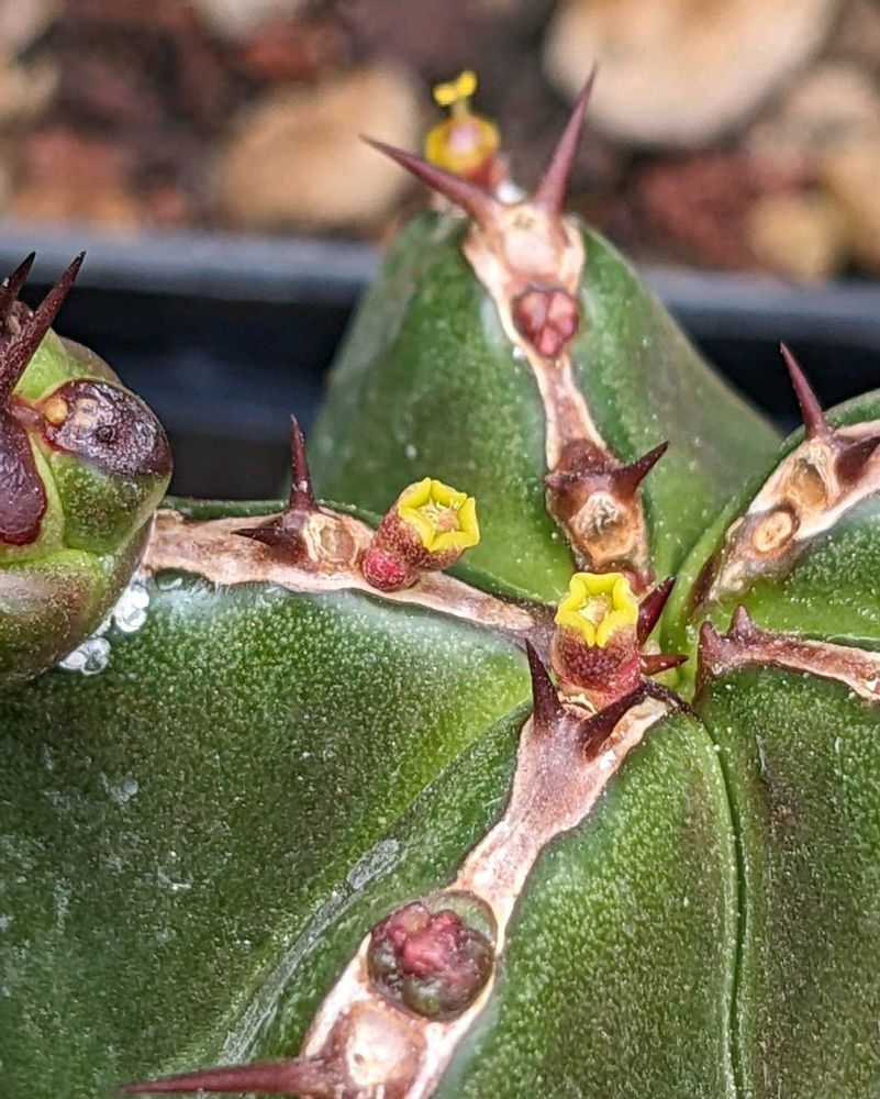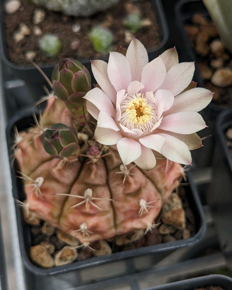 この冬スーパーで翌日にでも処分されそうだった株。ギムノカリキウムだったから保護してきた後初めて開花。中心部がうっすらピンクの持ってなかった色で嬉しい🩷
