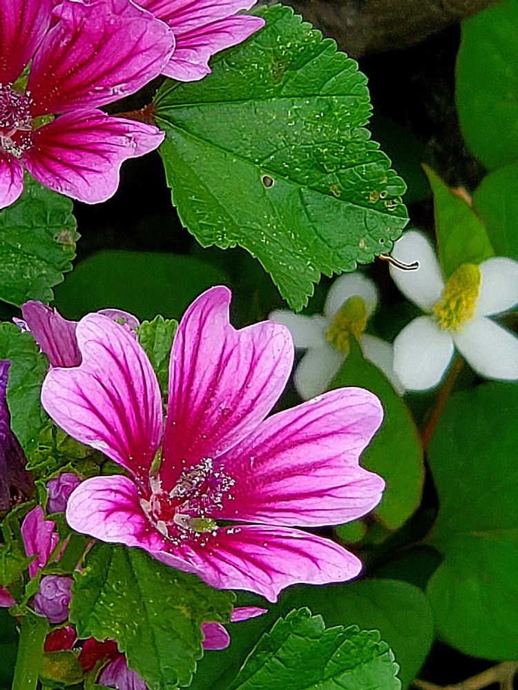 ゼニアオイの奥に咲いてるドクダミ可愛いですね🤭