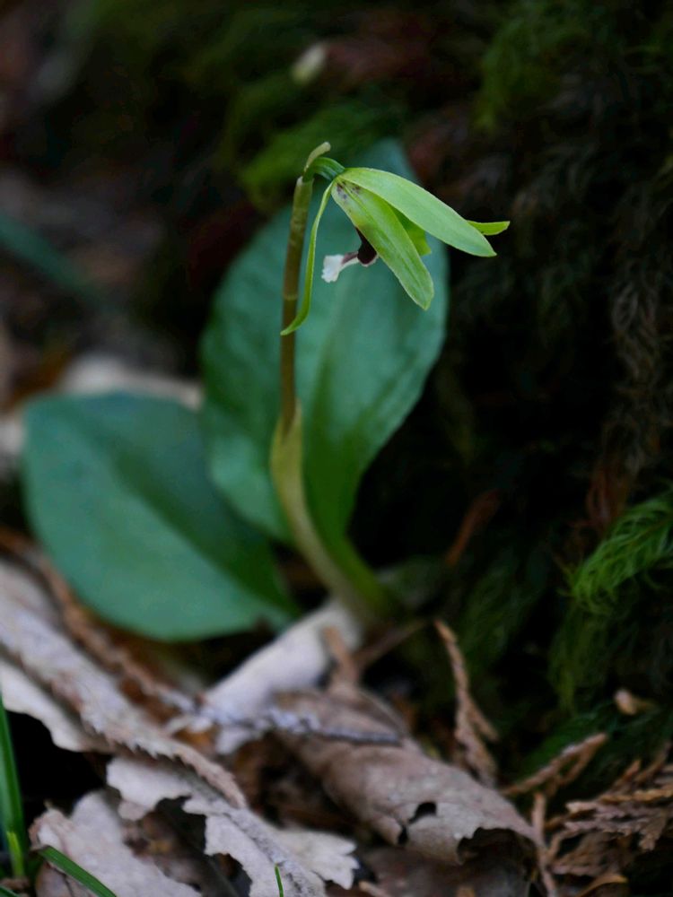 一葉蘭は文字通り葉っぱが一枚しかありません。また良く見れば葉っぱの模様や肉厚感が違うのですが同じ林床にあるので一瞬騙されます😅