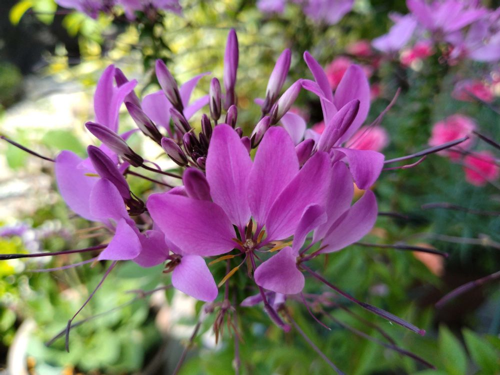 従来のクレオメとかなり違い 先ずは、臭み、とげ、べたつく葉っぱの問題がなくなりました。セニョリータロザリータはタネを作らない半耐寒性多年草である。との事