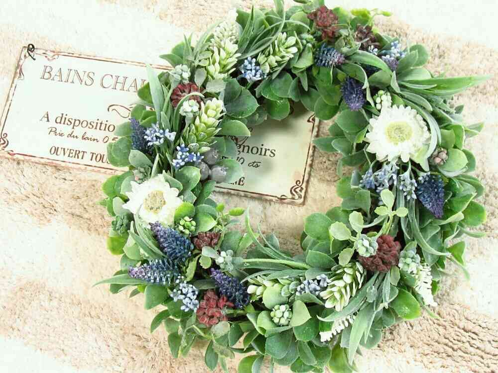 こちらのリースは、手元に中途半端に残ったアーティフィシャルフラワーを使ったリースです。どこに何を配置するか悩みました(^_^;)が、けっこうバランスよくできたのでは(^^)v…と、自画自賛ですf(^_^;。