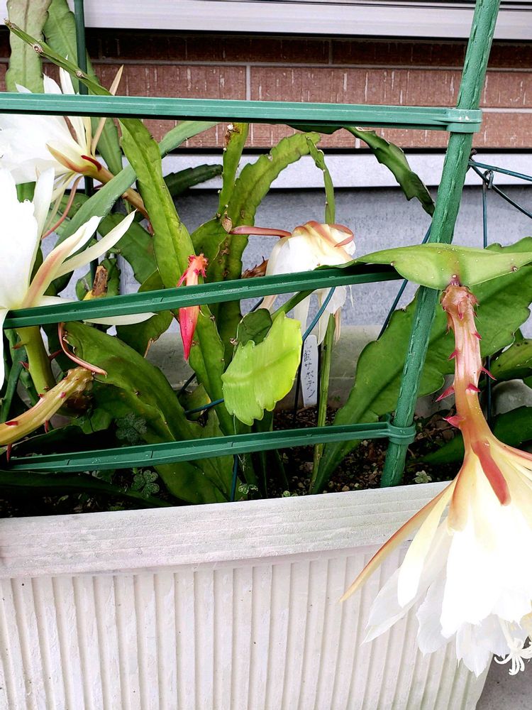 白の孔雀サボテンが一度に4個も咲いたのは初めてです 友達から10年程前頂き其からずっとほったらかし🙏
