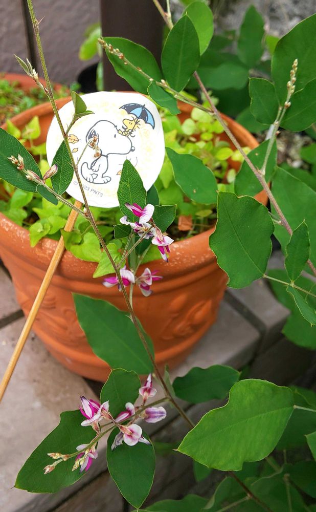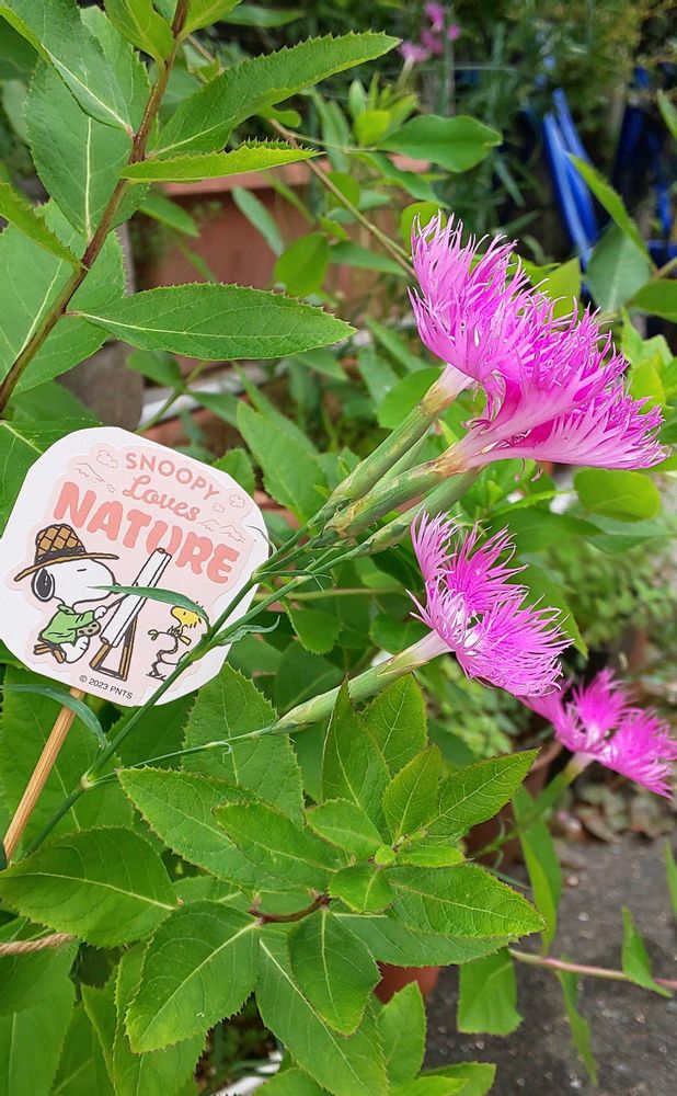 ①河原撫子の茎にスヌーピーピックを紐で括り付けて