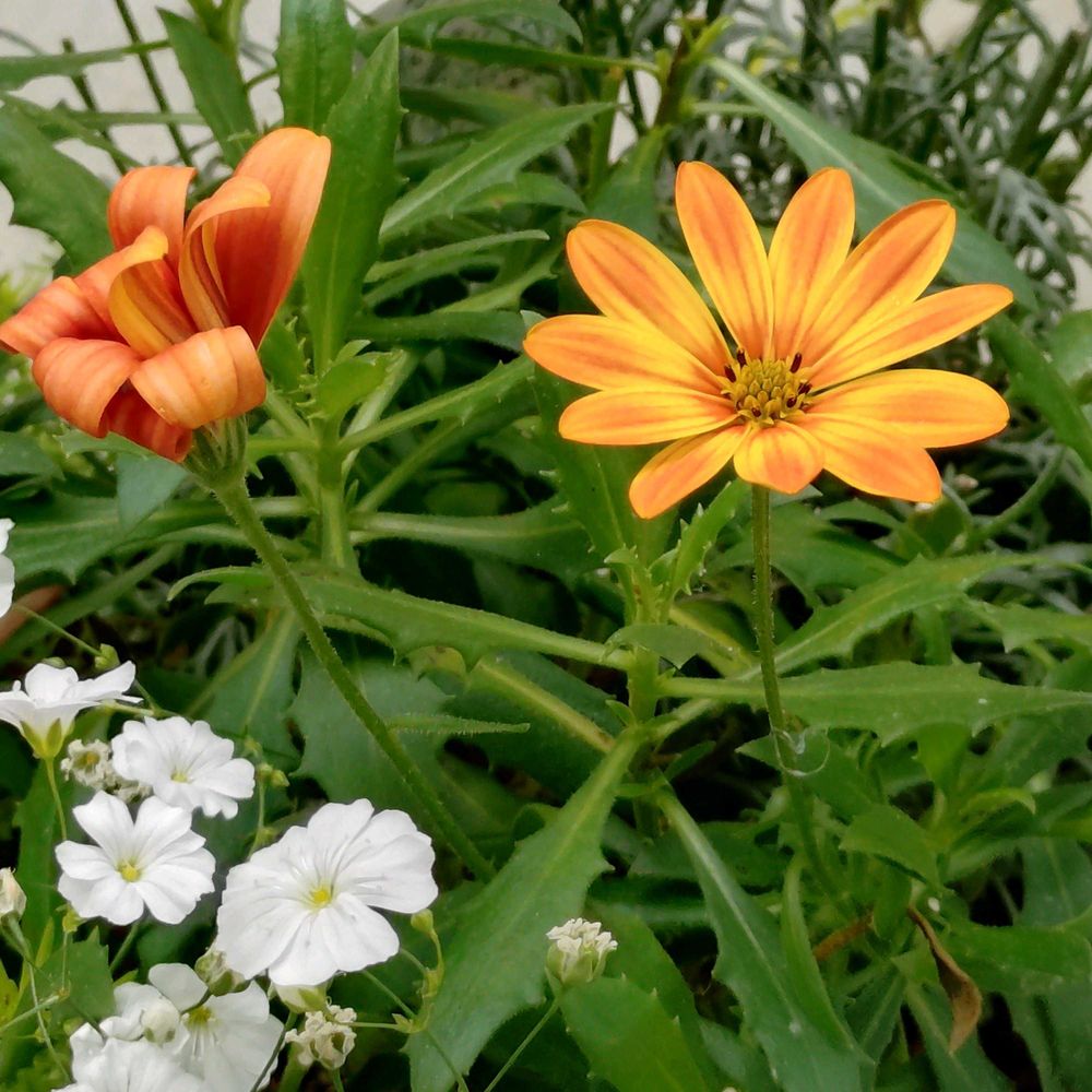①今朝の🧡色オステオスペルマム 閉じかけているのとお日様のようにも見える開きで咲いてますが空はなんだかどんより気味😟 ☀️さま出てほしいなぁ〜