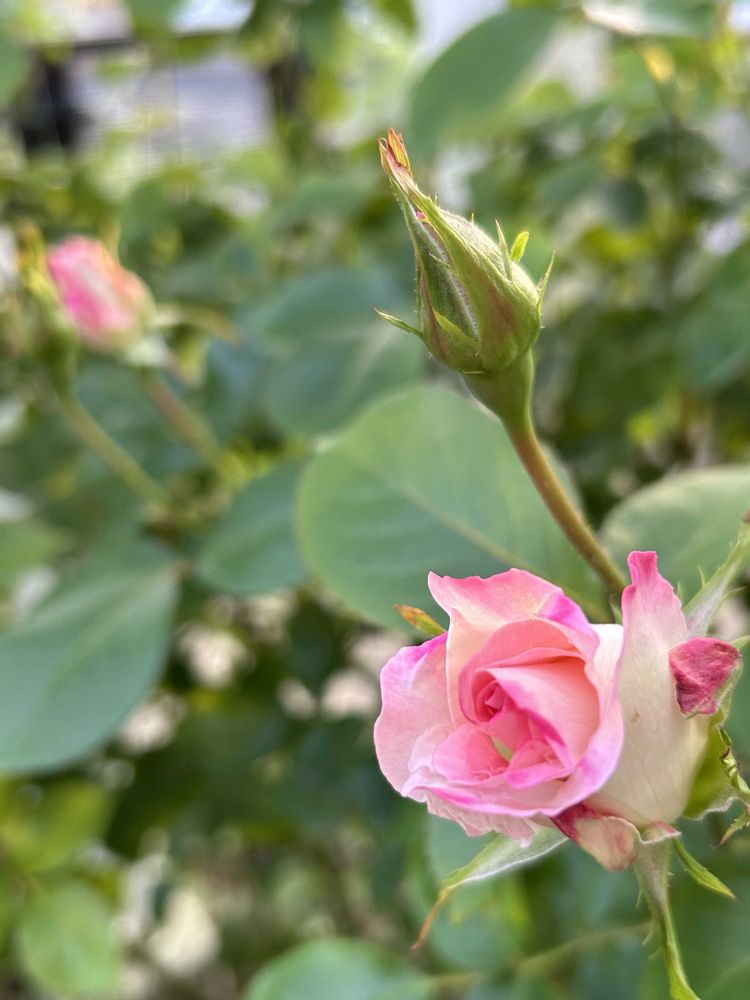シュラブ系のバラで実家のポーチ前にいます。やっとポツポツ開き始めました😊。🇫🇷生まれのバラですがマチルダは誰のことなんだろう。