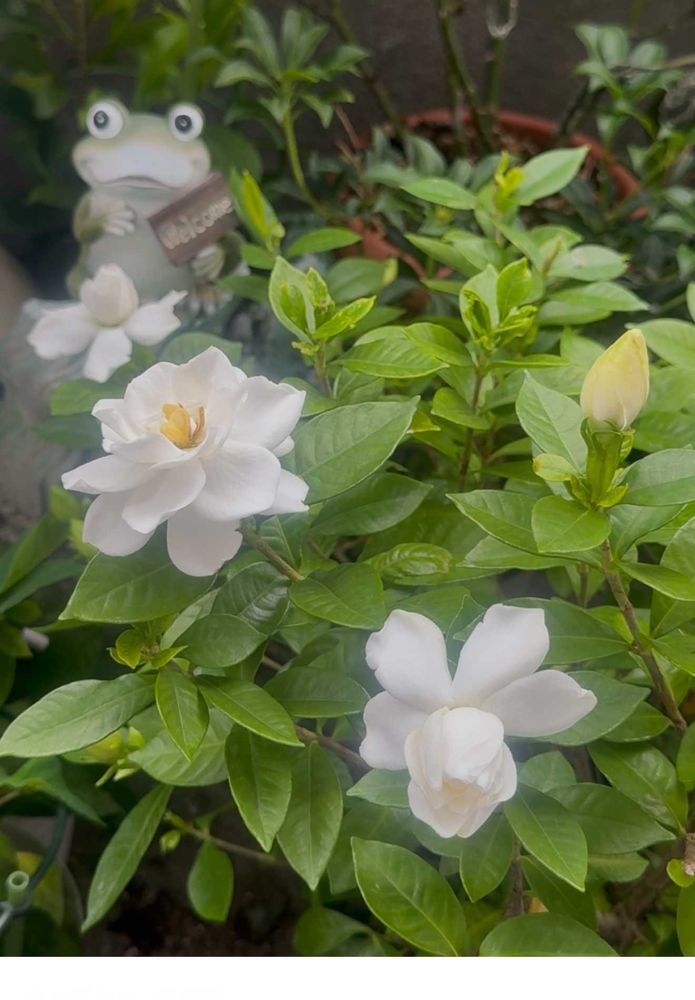 📝一夜明けて、今日6月2日朝6時過ぎ頃、ベランダで🪴鉢植えで植栽・養生中の梔子:くちなしが3個開花して、花つぼみ が1個今にも開花しそうに膨らんでいましたので、📱パチリしてみました。