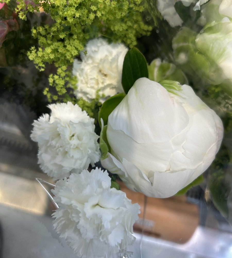 白いカーネーションと白いシャクヤク、爽やかな花束です💐🤍